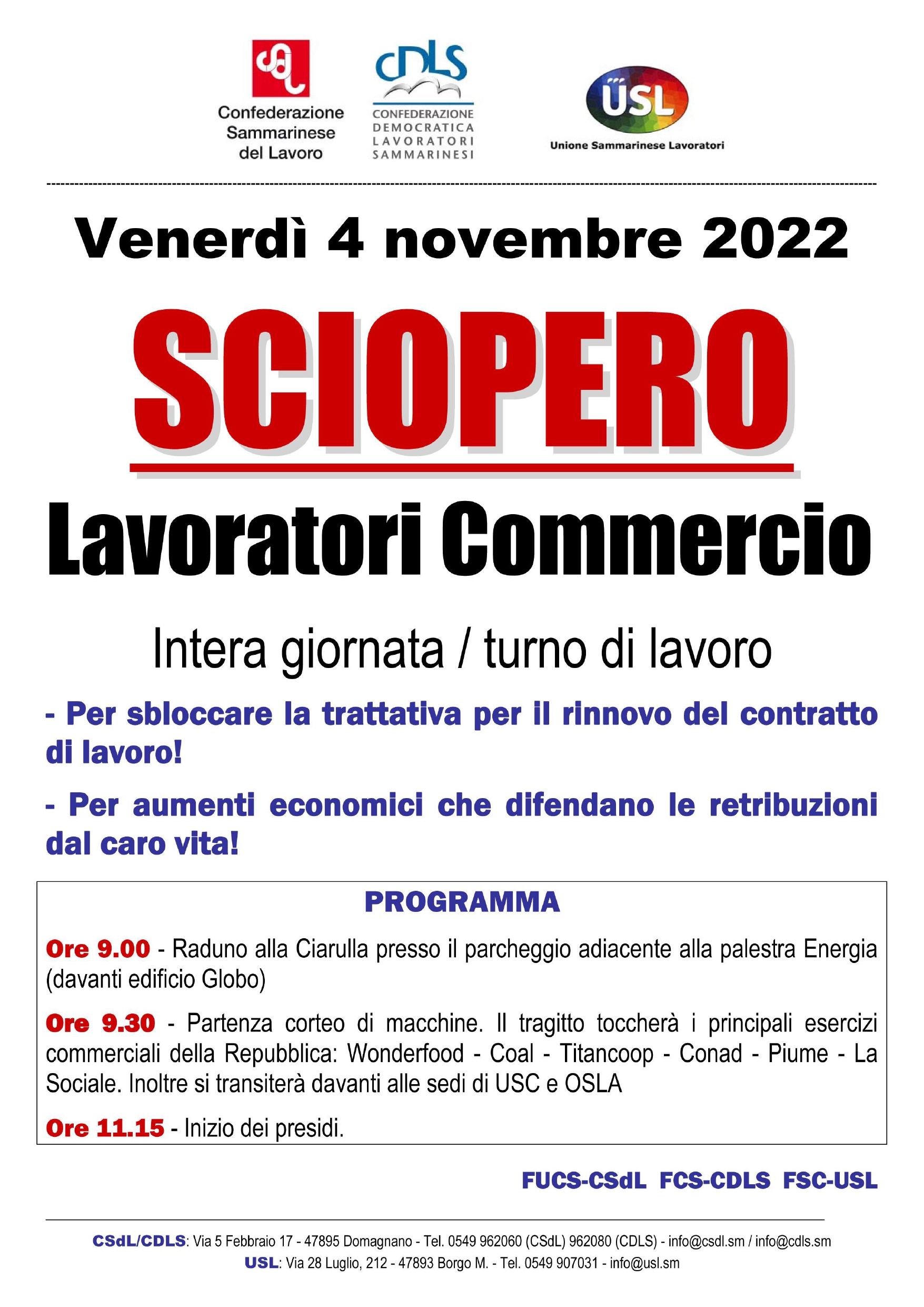 RSM 3 11 2022 – I lavoratori impiegati nel settore Commercio sono pronti a incrociare le braccia per l’intera giornata del 4 novembre. Il loro contratto è infatti scaduto dal 2018 e l’aumento proposto dalle associazioni datoriali è stato ritenuto dai lavoratori non adeguato, considerata la forte e continua perdita di potere d’acquisto dovuta ad una inflazione galoppante.