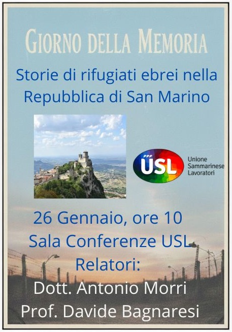 L’Unione Sammarinese dei Lavoratori, che fonda la propria azione sulla tutela delle persone, dei diritti e della dignità umana, ha promosso una conferenza dal titolo “Storie di rifugiati ebrei nella Repubblica di San Marino”, affidata al dott. Antonio Morri e al prof. Davide Bagnaresi.
